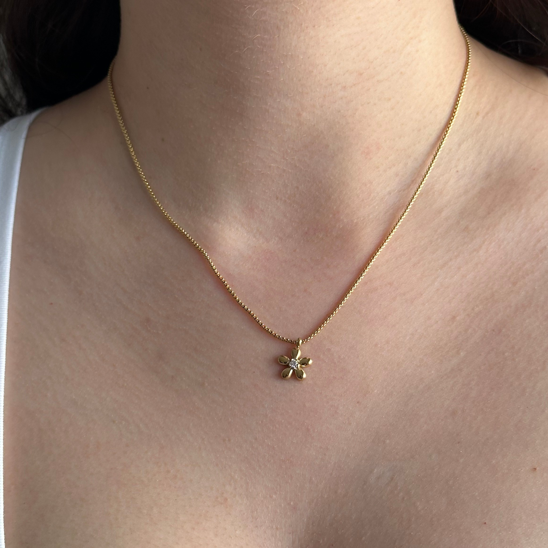 שרשרת עדינה עם תליון פרח משובץ בזירקון עדין למראה יומיומי ונקי.